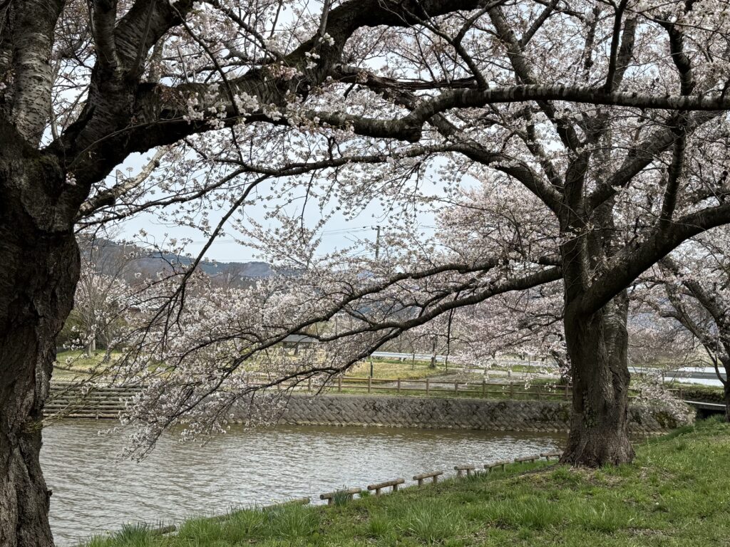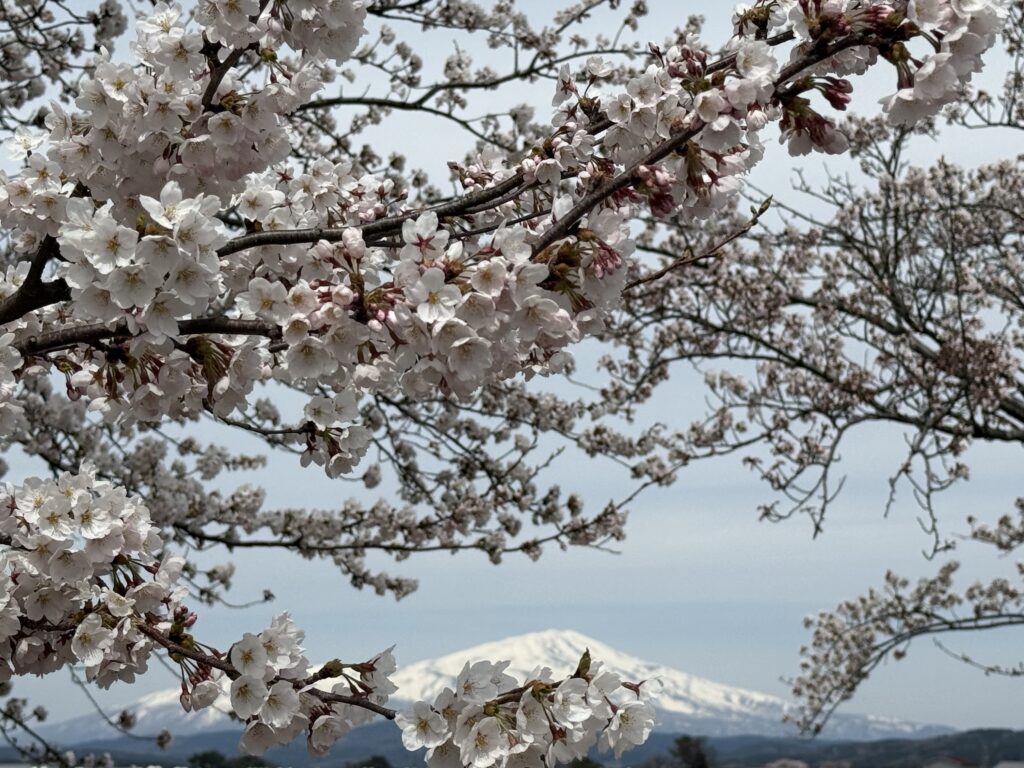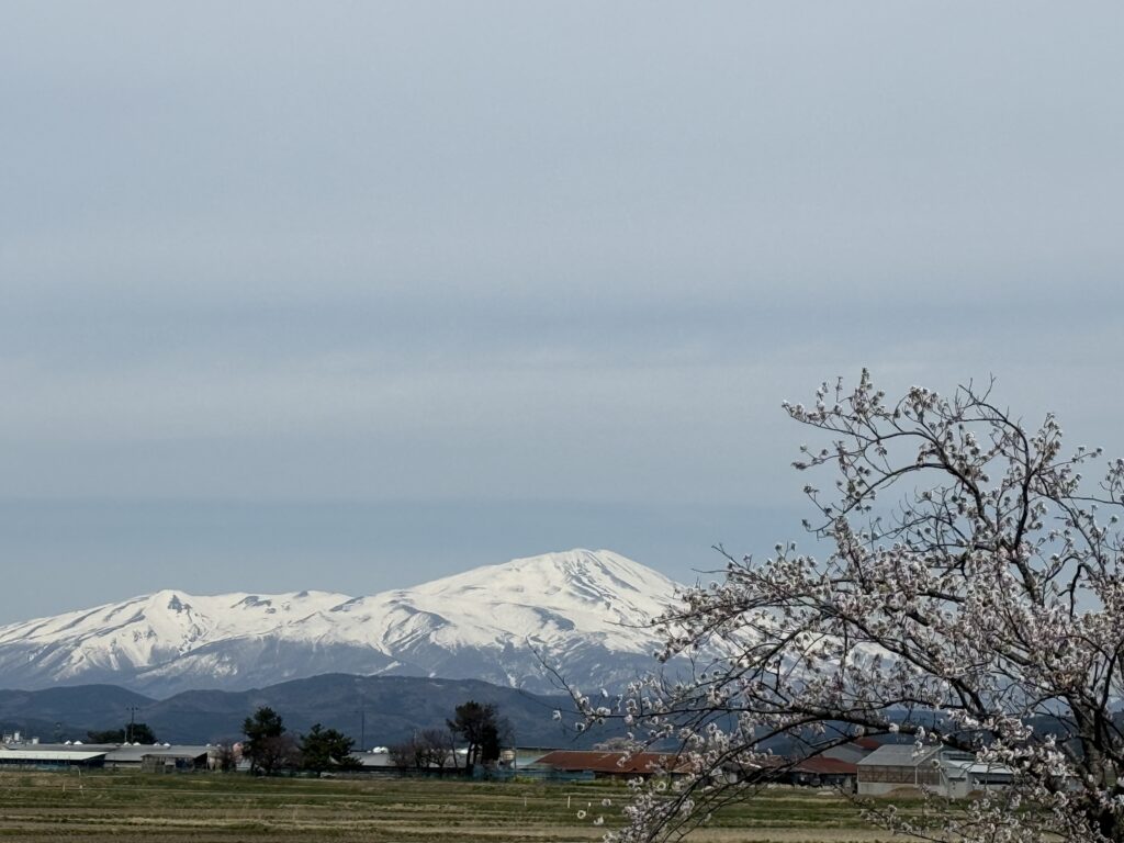 鳥海山も良く見え、桜と一緒に写真を撮ろうとしましたが、風が強く、桜の枝がブンブン揺れ大変でした。