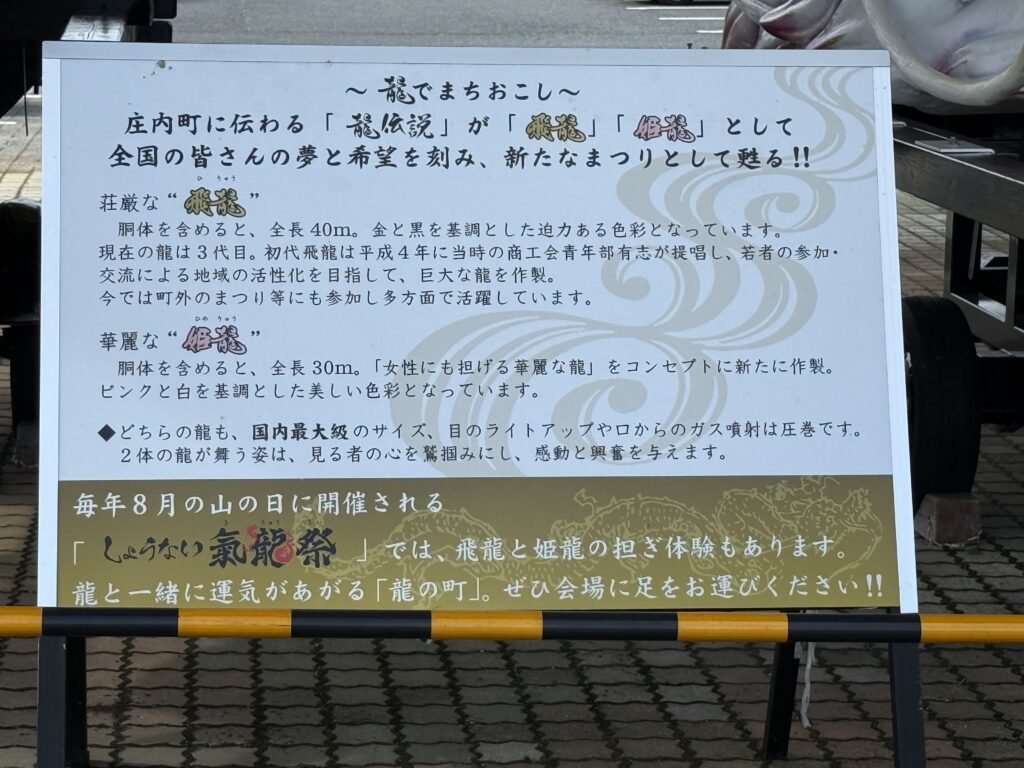 どちらの町にも龍にまつわる言い伝え(旧余目町に「飛龍伝説」、旧立川町に「龍神信仰」)があったことから、2つの町に共通する龍をコンセプトに町の発展と五穀豊穣を祈る新たな祭りが「しょうない氣龍祭」です。